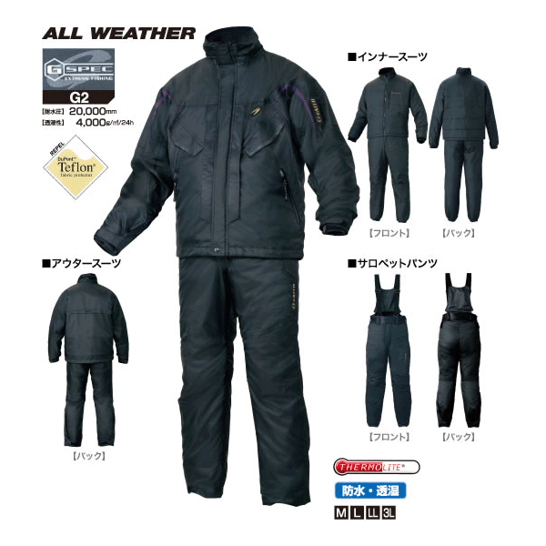 ■素材:アウター【表地】ナイロン100%(G-SPEC加工)【裏地】ポリエステル100%インナー【表裏地】ナイロン100%【中綿】ポリエステル100%(サーモライト)■重量/アウタースーツ重量:1.3kg(L)/インナースーツ重量:0.8kg(L)●4Pジャケット、内側ポケ、止水ポケ、ベスト接続、ロングファスナ、ドローコード、キャップフード、カフスフード、アジャスタベルト●適応サイズ(単位/cm):M(胸囲84?92、着丈70、袖丈90、腹囲78?94、尻囲105、股上33、股下73)、L(胸囲90?98、着丈73、袖丈93、腹囲82?98、尻囲110、股上34、股下75)、LL(胸囲96?104、着丈75、袖丈96、腹囲86?102、尻囲115、股上35、股下77)、3L(胸囲102?110、着丈77、袖丈98、腹囲90?106、尻囲120、股上36、股下79)